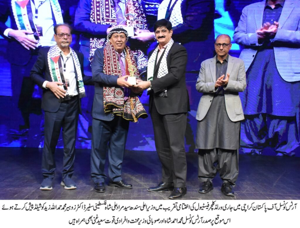 عہدیداران ، سندھ پولیس سمیت بین الاقوامی فنکار کا شکریہ ادا کرتے ہوئے کہاکہ سندھ حکومت کا تعاون ہمیشہ ہمارے ساتھ رہا ہے، آج شکریہ کا دن ہے، پاکستان اور متحدہ عرب امارات(UAE) کا رشتہ بھائیوں جیسا ہے، ایڈیشنل آئی جی وار تمام تعلیمی اداروں کا شکر گزار ہوں ، سندھ پولیس اور ہماری سیکیورٹی فورسز نے نہ صرف آرٹس کونسل ،ائیرپورٹ بلکہ پورے ہر جگہ ہمیں سیکیورٹی فراہم کی، ری دنیا سے آنے والے آرٹسٹوں میں 80 فیصد آرٹسٹ ایسے ہیں جو اپنی خرچے پر فیسٹیول میں شریک ہوئے۔ انہوں نے بتایا کہ میں نے 39 دن چیف سیکریٹری سندھ کو بہت پریشان کیا ، ہم نے اپنے آپ سے وعدے کیے تھے، پچھلے سال ورلڈ کلچر فیسٹیول میں 44 ملک تھے، اس سال پوری دنیا سے لوگ آئے ہیں، ہم نے جو سوچا اس سے بھی بڑا فیسٹیول ہوا، ہماری ٹیم، اسٹوڈنٹس ، والینٹر ز کسی نے کوئی آرام نہیں کیا ، کسی نے کوئی چھٹی نہیں کی، اگلے سال ہم اس سے بھی بڑا فیسٹیول کریں گے ، 1000 سے زائد پاکستانی آرٹسٹ یہاں موجود ہیں ، گلوبل کمیونٹی خواتین کے ساتھ زیادتی، بچوں کے استحصال، اور نسل کشی سے واقف ہے، ہم امن چاہتے ہیں، ہم اپنی آواز اپنے آرٹ کے ذریعے اٹھا رہے ہیں، فنکار جنگ نہیں چاہتا۔انہوں نے کہاکہ آج سندھ کا ثقافتی دن ہے، ہم ورلڈ کلچر فیسٹیول کے آخری روز سندھی کلچر ڈے بھی منا رہے ہیں، اختتامی تقریب میں فلسطین کے سفیر ڈاکٹر زوہیر محمد حمد اللہ زیدنے وزیراعلیٰ سندھ سید مراد علی شاہ اور صدر آرٹس کونسل محمد احمد شاہ کو فلسطین کا علامتی رومال پہنایا جبکہ وزیراعلیٰ سندھ نے فلسطینی سفیر اور تمام فنکاروں کو سندھ کی ثقافتی اجرک پہنائی اور شیلڈ پیش کی۔
