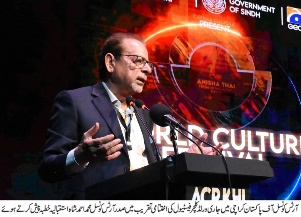 آرٹس کونسل آف پاکستان کراچی کے زیر اہتمام 39روزہ ”ورلڈ کلچر فیسٹیول 2025“ عالمی ثقافتی سرگرمیاں سمیٹتے ہوئے اختتام پذیر ہوگیا۔ اختتامی تقریب میں وزیراعلیٰ سندھ سید مراد علی شاہ نے خصوصی شرکت کی۔ صدر آرٹس کونسل محمد احمد شاہ تمام مہمانوں کا پرتپاک استقبال کیا۔ تقریب میں صوبائی وزیر محنت و افرادی قوت سعید غنی ، اراکین گورننگ باڈی، ایڈیشنل آئی سندھ جاوید عالم اوڈھو، ڈی آئی جی ایس ایس یو ڈاکٹر مقصود احمد، محمد عرفان سومرو، ڈائریکٹر خانہ فرہنگ ڈاکٹر سعید طلبی نیا، ڈائریکٹر برٹش کونسل لیلا جمیل، ڈائریکٹر الائنس فرانسز ایمنوئیل بریوریک، ڈائریکٹر گوئٹے انسٹیٹیوٹ کراچی آندریاس شیکوفر، قونصل جنرل تھائی لینڈ سوراشیٹ بونتینند، قونصل جنرل ملائیشیا ہرمان ہارڈینیاتا احمد، قونصل جنرل ایران اکبر عیسیٰ زادہ، قونصل جنرل سری لنکا سنجیوا پٹی ویلا، قونصل جنرل جاپان ہیٹوری مساورو، قونصل جنرل متحدہ عرب امارات بخیت عتیق الریمیتی، قونصل جنرل جرمنی تھامس ای شولٹزے، برٹش ڈپٹی ہائی کمشنر لینس ڈوم، موروکو کے سفیر محمد کارمون، فلسطینی سفیر ڈاکٹر زوہیر محمد حمد اللہ زید، فلپائنی سفیر ڈاکٹر ایمانوئل آر فرنینڈیز، مرزا اشتیاق بیگ، مرزا اختیار بیگ سمیت چیئرمین الحمراءآرٹس کونسل لاہور رضی احمد ، ڈائریکٹر جنرل PNCA ایوب جمالی، خالد محمود، طارق رفیع، شاہد ملک و دیگر شریک تھے۔سمیت سمیت عوام کی بڑی تعداد نے شرکت کی۔ تقریب کا آغاز تلاوت قرآن کے بعد پاکستان کا قومی ترانہ بجا کر کیا گیا۔ تقریب میں 39روزہ ورلڈ کلچر فیسٹیول 2025 میں ہونے والی عالمی ثقافتی سرگرمیوں پر مبنی شو ریل پیش کی گئی۔ وزیر اعلیٰ سندھ سید مراد علی شاہ نے اختتامی تقریب سے خطاب کرتے ہوئے